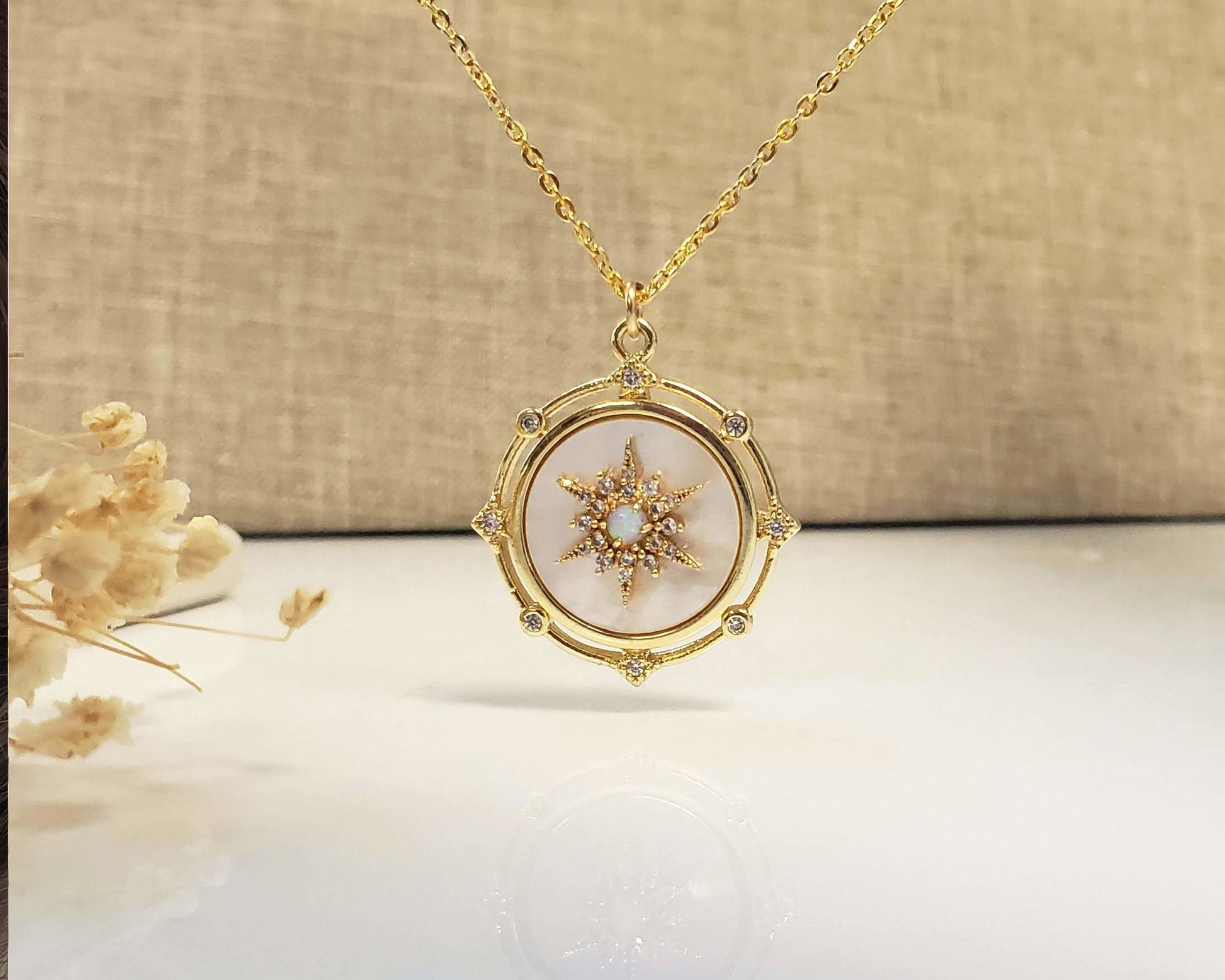 Our Celestial Mother of Pearl Necklace combines the iridescent beauty of genuine mother of pearl with the timeless beauty of an opal. This necklace is part of our popular and trendy Celestial collection. The North Star center of this medallion is a symbol of direction, guidance, and hope. The star combines opal with many brilliant cubic zirconias.